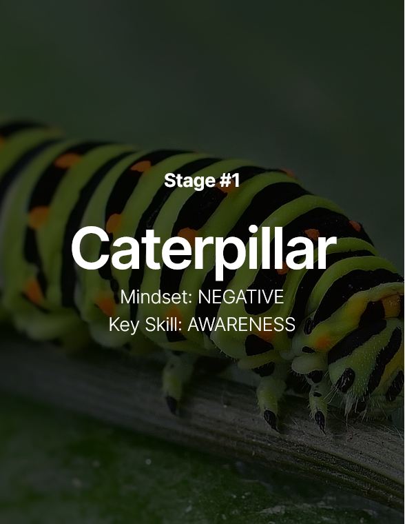 The most important skill to cultivate in the Caterpillar stage is AWARENESS. Simply put, most people are unaware of the negative thoughts, beliefs, etc. that appear inside or around them on a daily basis. Like the (fictional) tale about a frog in a slowly heated pot of water, negativity becomes the environment that we tolerate and ignore until the temperature is too extreme to bear.