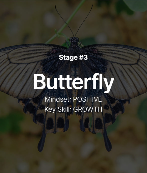 Being able to face negativity in a neutral, balanced way is great. However, if you really want to “fly”, then the Butterfly stage is for you..! The key skill in this stage is GROWTH. You’ll amplify the skills of the previous stages to envision bold, new ways to engage life.